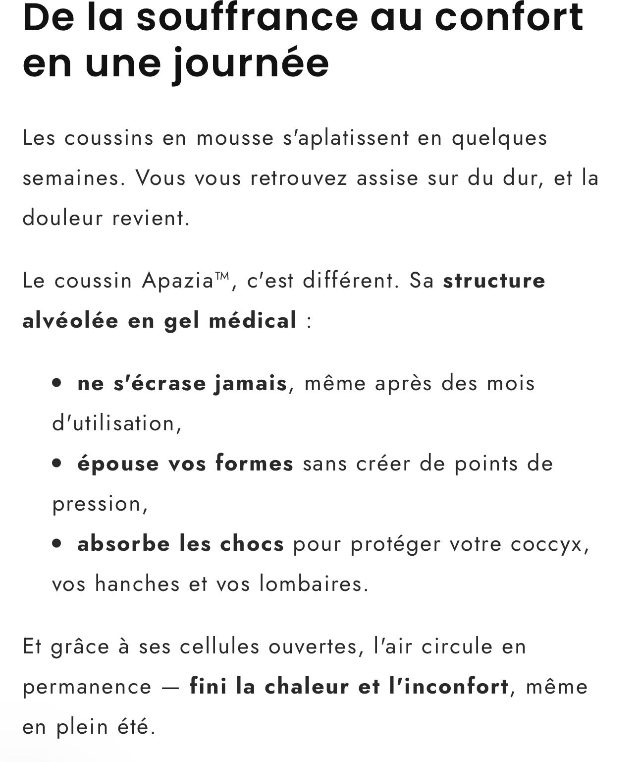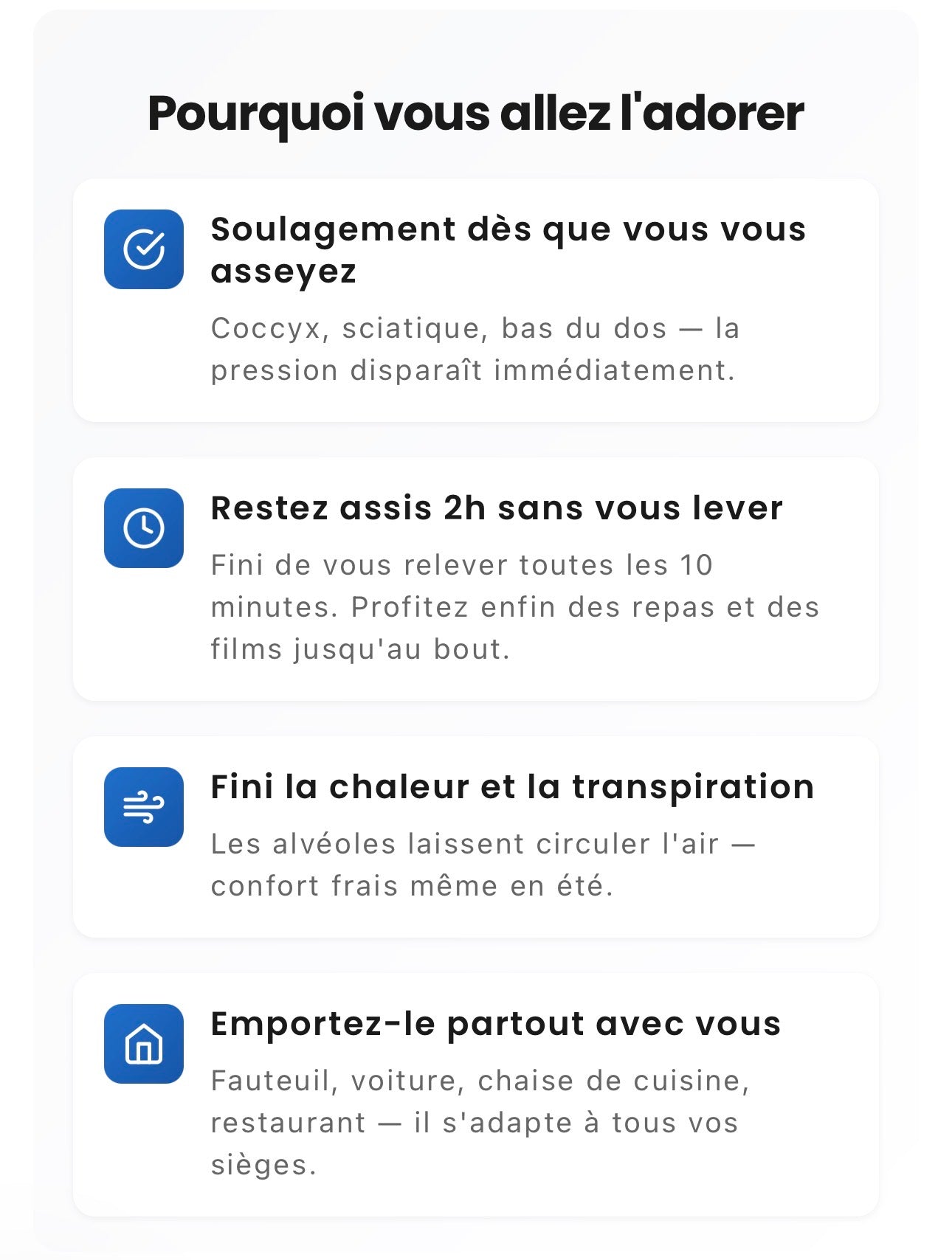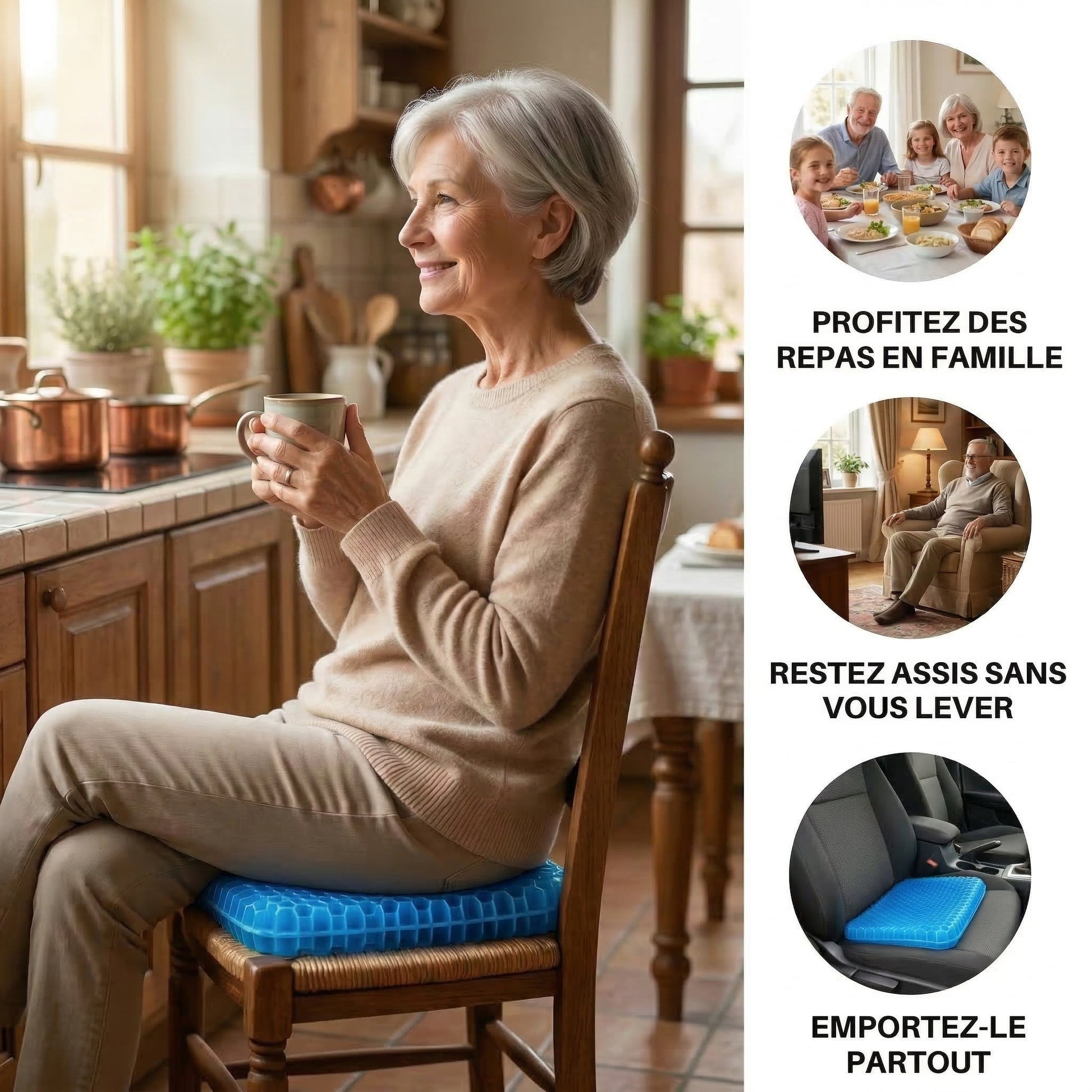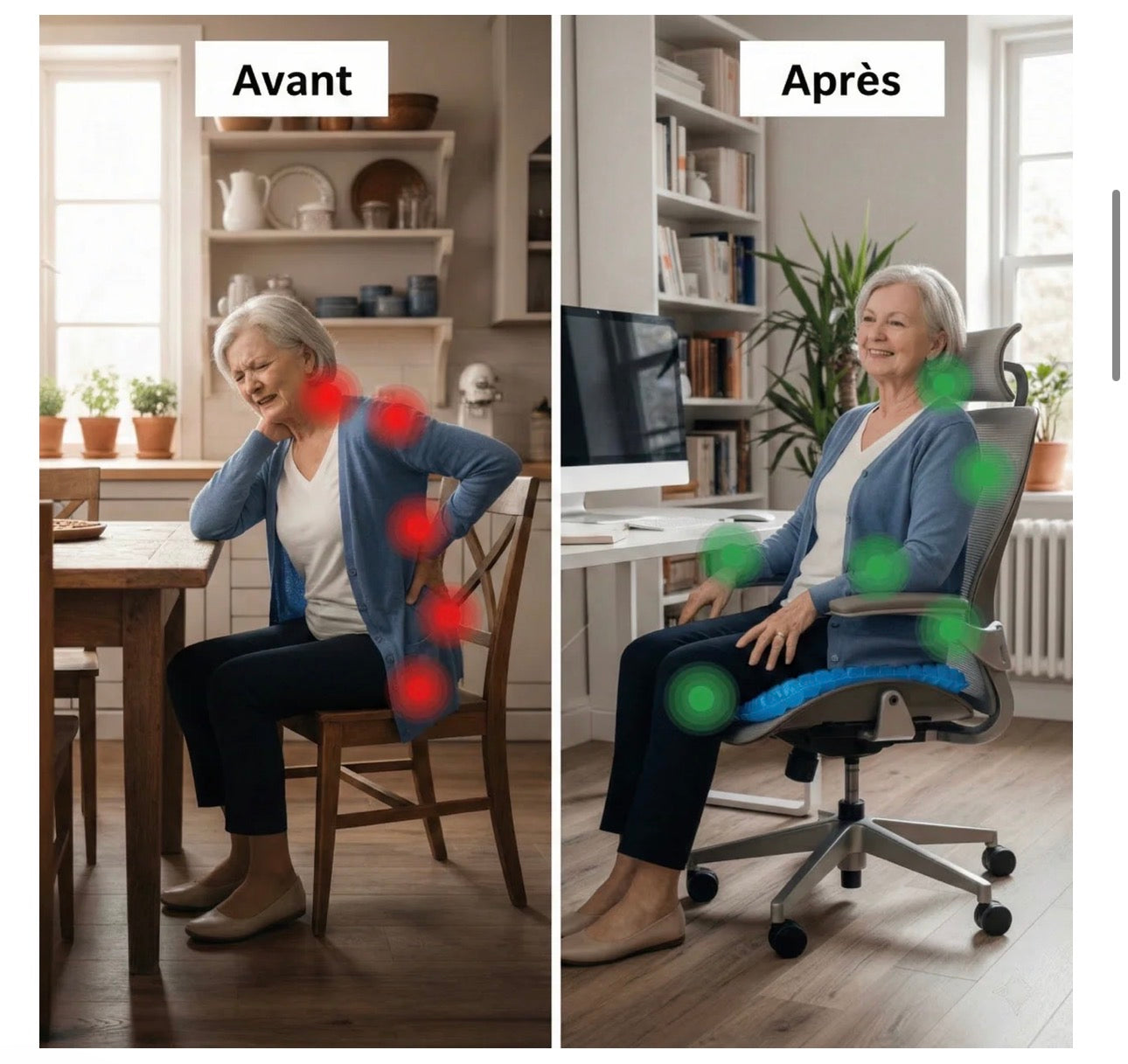 Absolument ! Le coussin est conçu pour un usage prolongé (8h+). Contrairement à la mousse qui s'affaisse, le gel haute densité conserve ses propriétés de soutien toute la journée. La structure respirante évacue la chaleur pour éviter la transpiration.