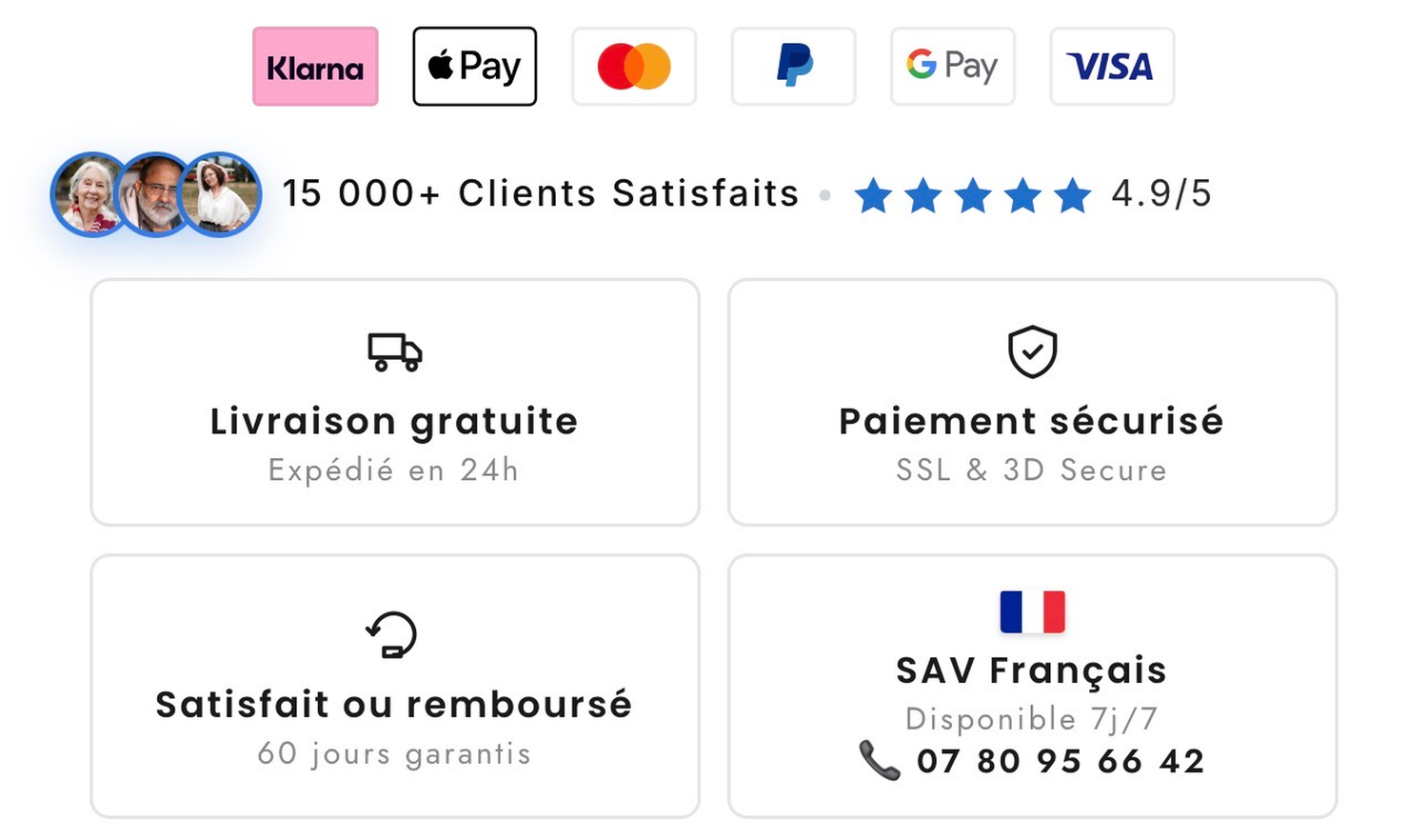 Vous avez 60 jours complets pour tester. Si vous n'êtes pas totalement satisfait, nous vous remboursons intégralement sans poser de questions. Retour gratuit, aucun frais caché. Vous ne prenez aucun risque.